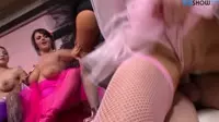 The video begins with a group of horny men and sluts gathered at the Happy Studs mansion for a wild orgy night.The camera zooms in on our main character, Happy Stud, who is seen as a stud among other dudes, maneuvering through the throng of girls and sluts.The atmosphere is electrifying as the men are fully charged to play with these sexy sluts.Soon, an arousing blowjob session kicks off with one of the girls on her knees, sucking on the cocks of multiple dudes at the same time, while another dude is fucking her pussy from behind.Happy Stud is right in the middle of it all, guiding the events with his womanizing charisma.The sexy sluts are taking turns sucking their mens dicks and getting fucked hard by them, making sure they reach a blissful orgasm through the swapping positions and frills.One slut, wearing only stockings that accentuate her long legs, is on the receiving end of multiple cocksucker cocks while she herself sucks a dudes dick passionately.Her tight cunts are being played with as another horny stud licks her clit, increasing her pleasure immensely.The swapping and positioning of these wild animals ensures that the orgy becomes an unforgettable event.Happy Stud and his fellow dudes take turns to bang each sexy slut in every imaginable way doggy style, from behind, face sitting, cowgirl, reverse cowgirl, you name it.The cunts are so wet with all the erections that they can hardly contain them all.Every guy in the room is thrusting their cocks in and out of these willing and eager sluts.Throughout the orgy, the studs and sluts communicate without words, using moans, groans, and other erotic sounds to signal which position, action, or stimulation they desire.The guys are masturbating themselves with each others dicks, sucking on each others cocks and balls, licking their way up and down the sluts bodies, while some sluts take turns in satisfying multiple men at once with their eager mouths and cunts.As the orgy progresses, the intensity builds up until the climax is reached.Happy Stud, seeing all the satisfied faces around him, gives an erotically charged command for a massive cumshot.The sexy sluts are drenched in streams of cum as it splashes on their tits, faces, and cunts.Semen flies through the air like sperm rain, making quite the mess.But the horny studs couldnt care less they bask in their glorious moment of pleasure, satisfaction, and orgasmic bliss.